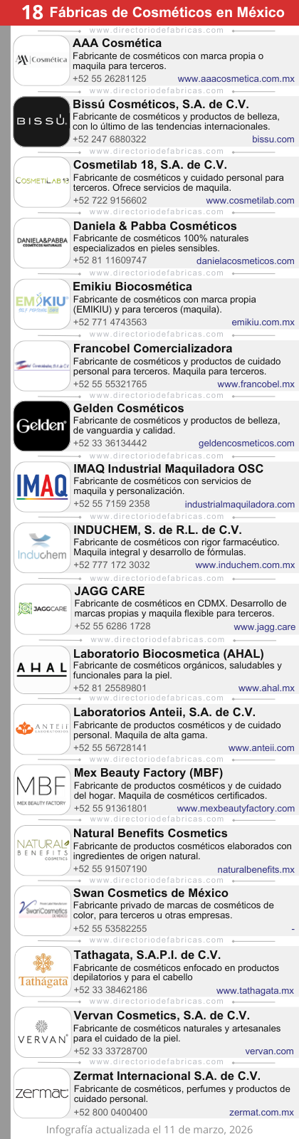 Este directorio (Edición 2026) compila datos clave de diversos fabricantes de cosméticos. Encontrarás un análisis técnico de las fábricas de cosméticos en México con mayor relevancia en infraestructura y capacidad de respuesta B2B.